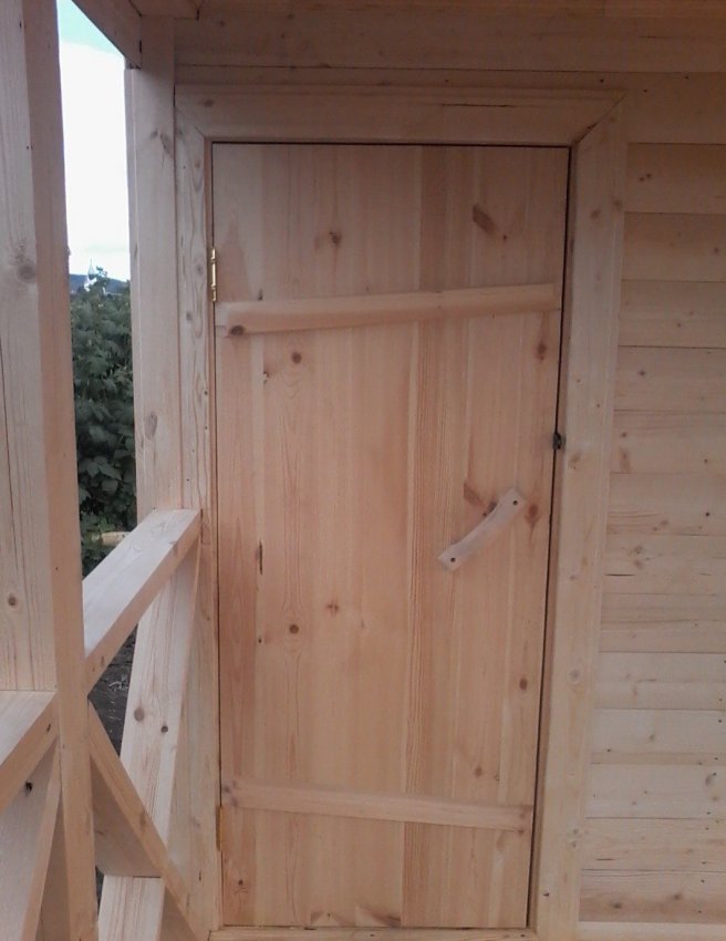 Проще всего сделать дверь из шпунтованных досок: они легко собираются в щит, по периметру которого делается обвязка из бруса.