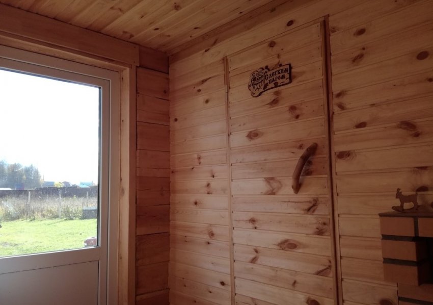 Обшитая вагонкой дверь облагораживает внешний вид бани
