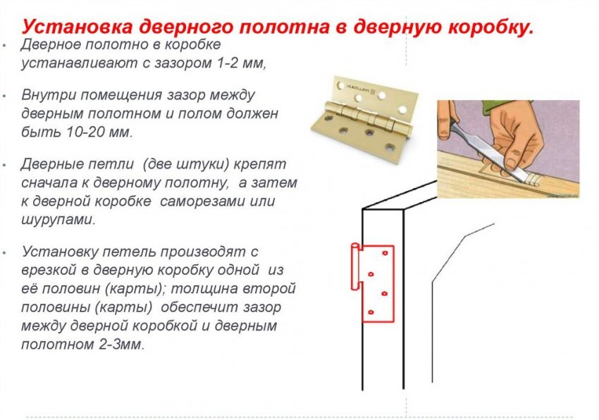 При установке дверной створки в первую очередь обращают внимание на зазоры между полотном и коробкой. Их размер должен быть одинаковым по обе стороны. Допустимым считается зазор от 2 до 4 мм. Если петли регулируемые, возможна корректировка, но в подавляющем большинстве случаев для межкомнатных дверей используется нерегулируемое подвесное оборудование. Поэтому задача монтажника заключается в точной установке петель. Для этого нужны определённые навыки — врезка осуществляется с помощью стамески, поэтому нужно разбираться в свойствах древесины и иметь хороший глазомер. Некоторые виды петель (например, внутренние) требуют специального фрезеровального оборудования для выемки технологических отверстий.
