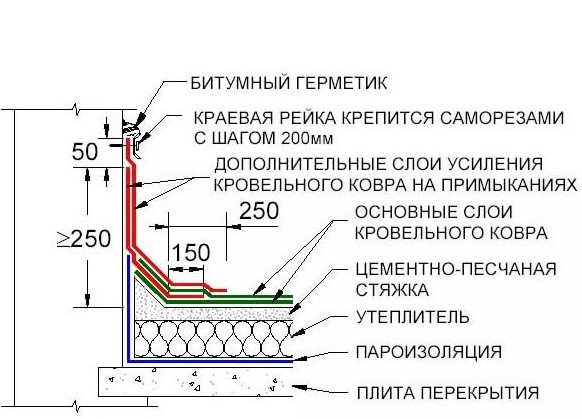 - Примыкание можно устроить и более надёжным способом — с использованием герметизирующей металлической планки. Её помещают между двумя слоями основного покрытия на парапете (стенке из труб прямоугольной формы). Такое сочленение образует надёжное и герметичное соединение.