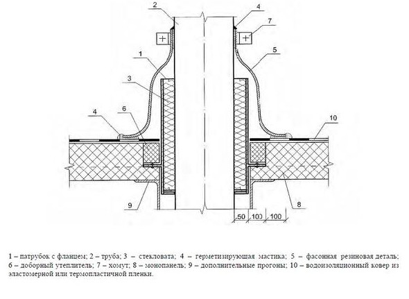 - Примыкание к круглой трубе выполняется с использованием специальных колпаков заводского изготовления. Верхний диаметр колпака равен диаметру трубы и фиксируется хомутом. Основание выполняется в виде плоскости и заплавляется основным покрытием в процессе установки. Колпаки выпускаются соответственно размерам основных стандартных труб, применяемых в строительстве.