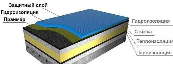 - Устроить цементно-песчаную стяжку толщиной до 10 см. При этом нужно выполнить все необходимые уклоны в сторону стока воды с кровли.