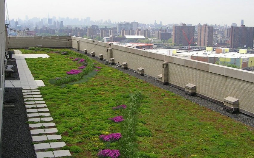 - С озеленением. Особенность такой кровли заключается в возможности воздействия корней растений на слой гидроизоляции. Именно поэтому требуется обустройство дополнительных элементов, а именно двойного слоя геотекстиля, между которыми находится профилированная дренажная мембрана. Только после этого можно укладывать плодородную почву с растениями. Причём растения должны быть специально предназначенными для использования на крыше.