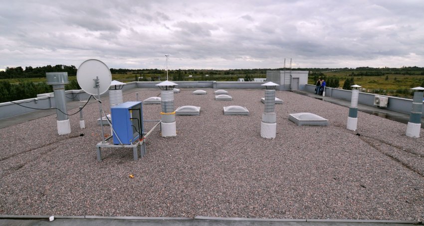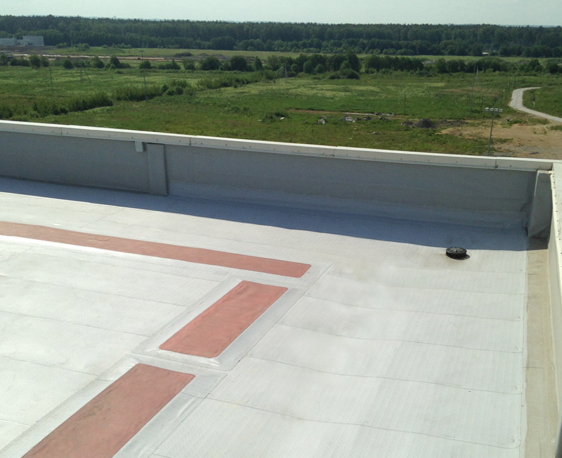 Обеспечить высокий уровень прочности, а также предотвратить чрезмерное накопление осадков на крыше помогут железобетонные плиты, которые устанавливаются под наклоном 2–6 градусов в направлении слива воды. Сверху укладывается гидроизоляционный слой, в качестве которого может использоваться ПВХ мембрана или любой наплавляемый материал, например, стеклоизол.