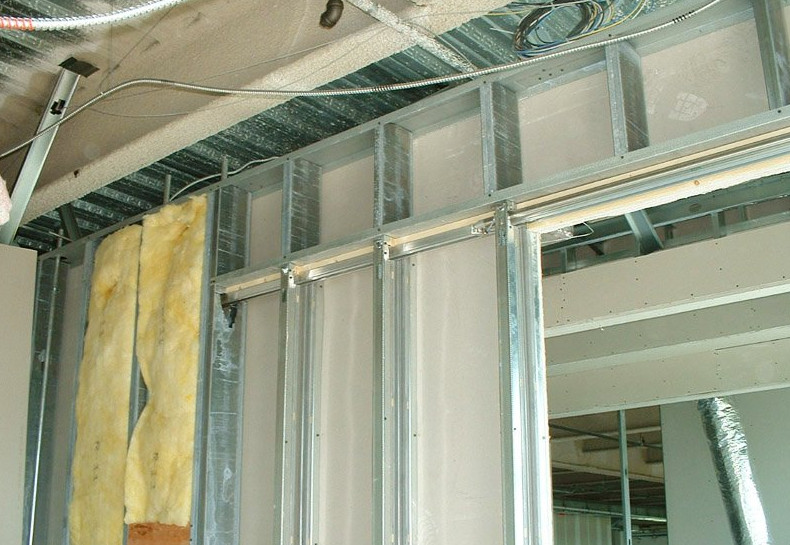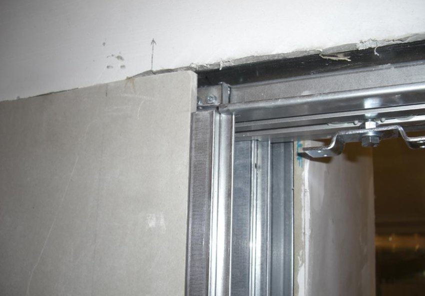 - Сооружение фальш-стены из гипсокартона. Сначала создаётся каркас из металлопрофилей, внутри оставляется место для двери. Ниша должна быть шире полотна на 20 мм, чтобы дверь не царапалась и ходила свободно.