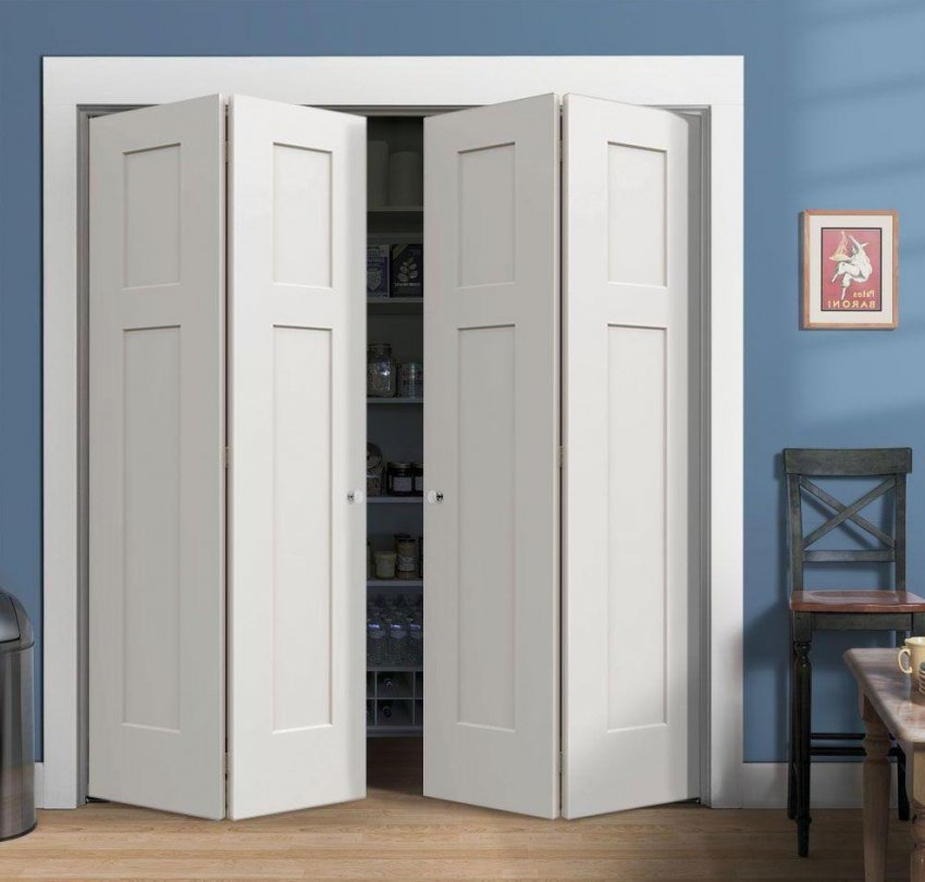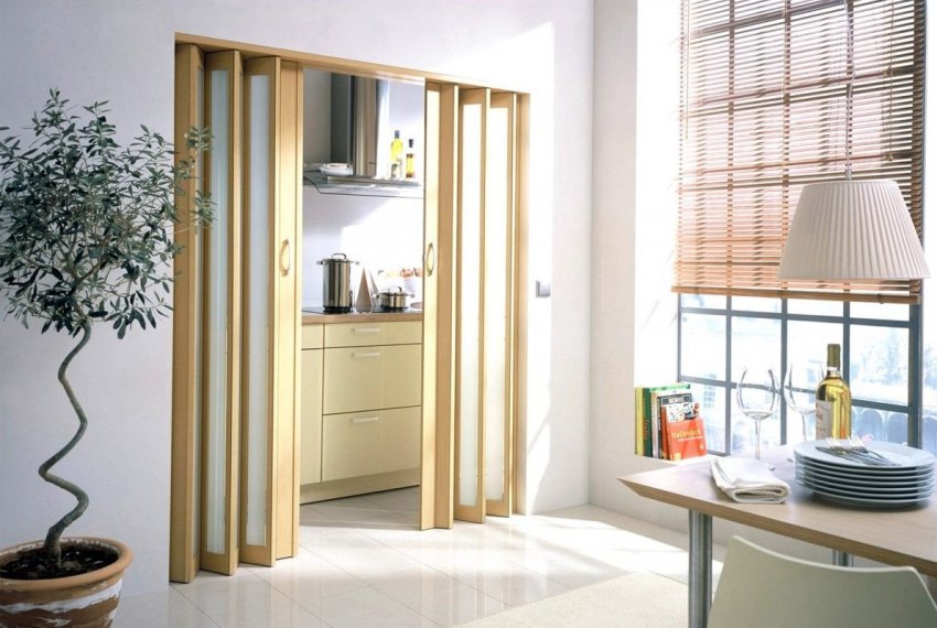 Двустворчатая дверь-гармошка из пластика удобна для кухни: редко используется, поэтому прослужит долго
