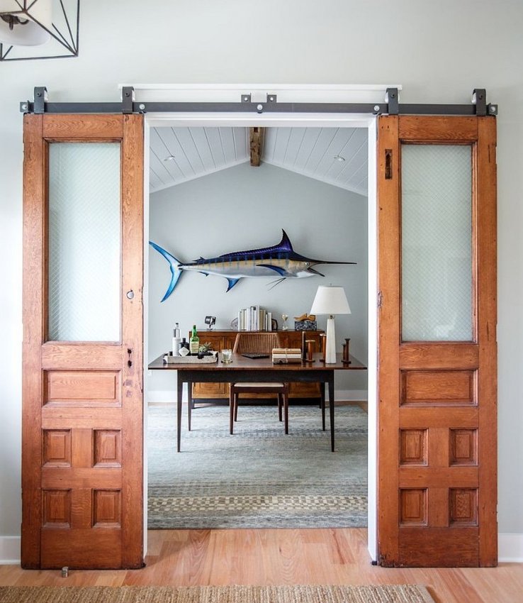 Амбарную дверь можно покрасить под цвет стен, и она создаст спокойную атмосферу в жилище
