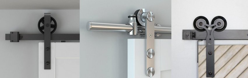 Крепления для амбарной двери делаются в разных стилистических оформлениях, чтобы можно было их подобрать под свой стиль интерьера