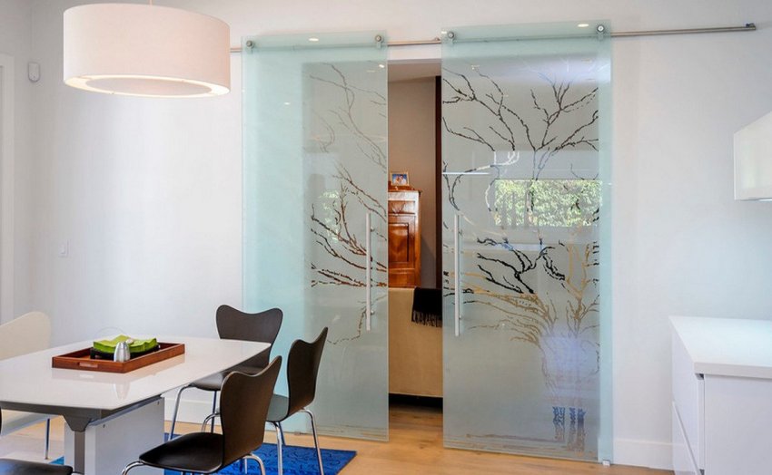Двустворчатые стеклянные двери делают из закалённого стекла и украшают рисунками
