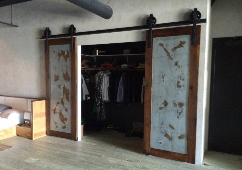 Амбарную дверь с полупрозрачными полотнами хорошо использовать в качестве створок шкафа или встроенной гардеробной комнаты