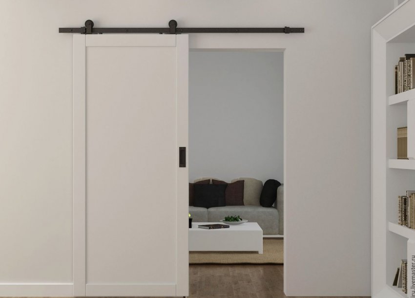 - широкие возможности: амбарные крепления способны выдерживать большой вес; можно расширить дверной проём, увеличив открытое пространство; или отделить дверями шкаф от комнаты. А в квартирах-студиях такая дверь будет выполнять ещё и функцию мобильной перегородки.