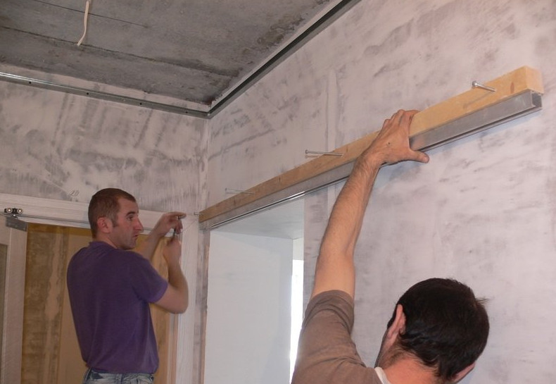 - Крепление направляющего профиля. К стене над дверным проёмом горизонтально крепится направляющая. С одной стороны она должна выступать на 5 см, а с другой — на ширину полотна.