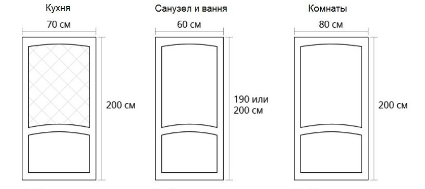 Существуют стандартные размеры дверных полотен: шириной 60, 70, 80, 90 см и высотой до 2 м.