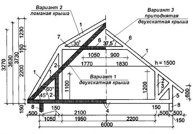 - Вариант ломаной двускатной крыши подразумевает использование стропил с разным углом наклона и различной длиной. Поэтому они считаются по отдельности. Если видоизменить конструкцию так, что угол наклона нижних скатов станет равным 60о, а верхних − 30о, то размеры стропил будут следующими: