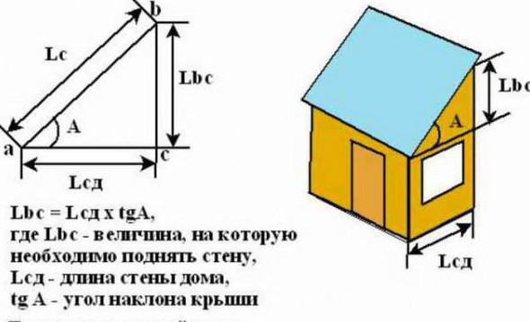- Lbc = Lac ∙ tg A, где Lbc − высота конька, Lac − половина ширины дома с учётом карнизного свеса, A − угол наклона ската.