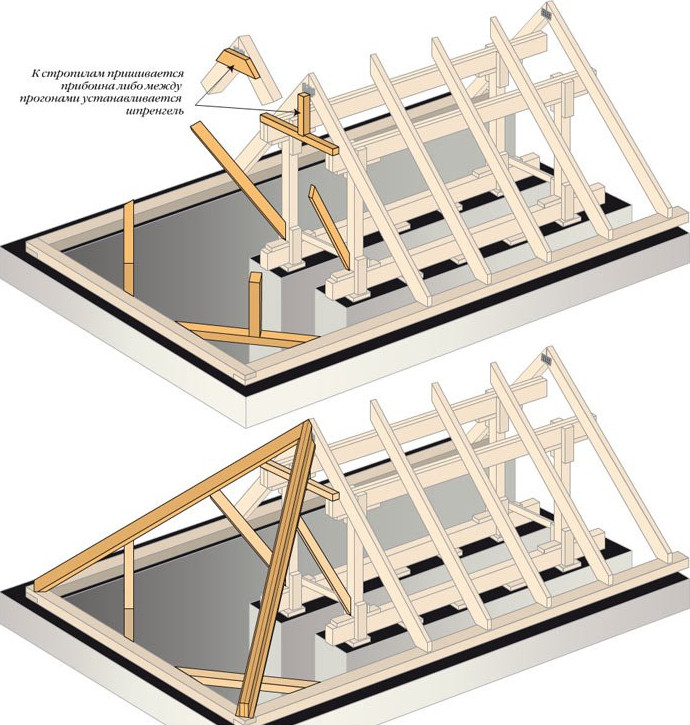 - Для укрепления нижних и верхних стропил используются подкосы, бабки и прибоины.