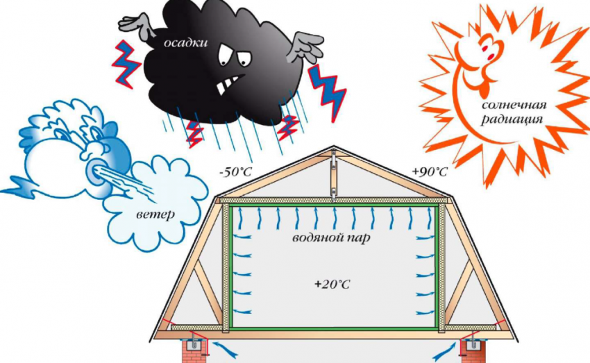 Тёплый воздух в помещении насыщается парами и поднимается, стараясь через любые отверстия выйти наружу. Но поскольку в подкровельном пространстве температура воздуха и влажность значительно ниже, образуется конденсат, который способен локализоваться на утеплителе, что может привести к его разрушению.