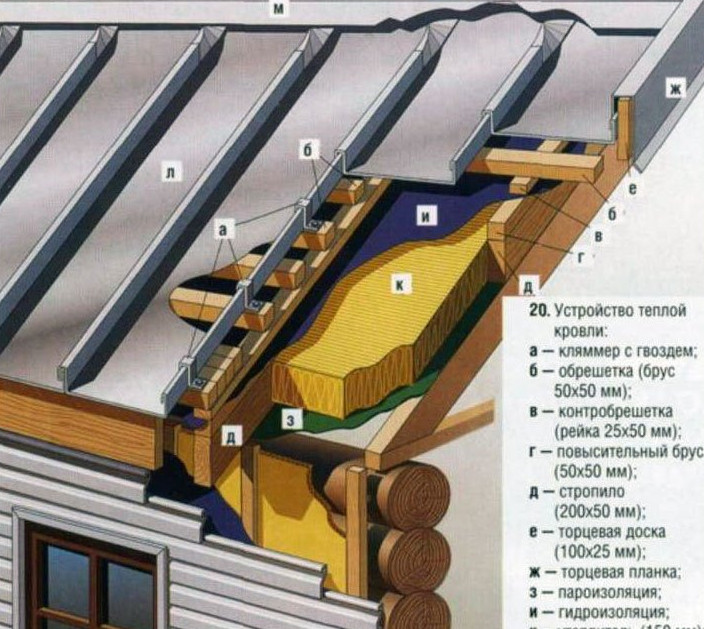 Устройство качественной, хорошо утеплённой и шумоизолированной фальцевой крыши подразумевает наличие таких элементов: