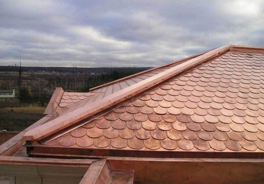 - Медь. Этот металл легче, красивее и мягче стали, поэтому покрывать им рельефные поверхности проще. Сначала листы сияют на солнце, но со временем медь окисляется и темнеет, а потом покрывается благородным зеленоватым налётом — патиной. На полированном металле очень заметны царапины, поэтому во время его монтажа надо быть очень аккуратным. Основной недостаток меди — высокая стоимость, но он полностью компенсируется большим сроком службы.