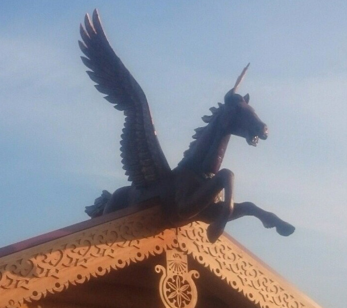 - Скульптурная резьба. Это самый сложный способ, справиться с которым может только опытный мастер. Объёмные деревянные фигуры используются для украшения конька, карниза и других элементов деревянного дома.