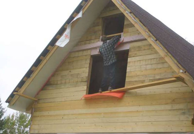 - Внешняя отделка фронтона монтируется на каркас поверх ветрозащиты. Обычно используется вагонка, блокхаус или имитация бруса.