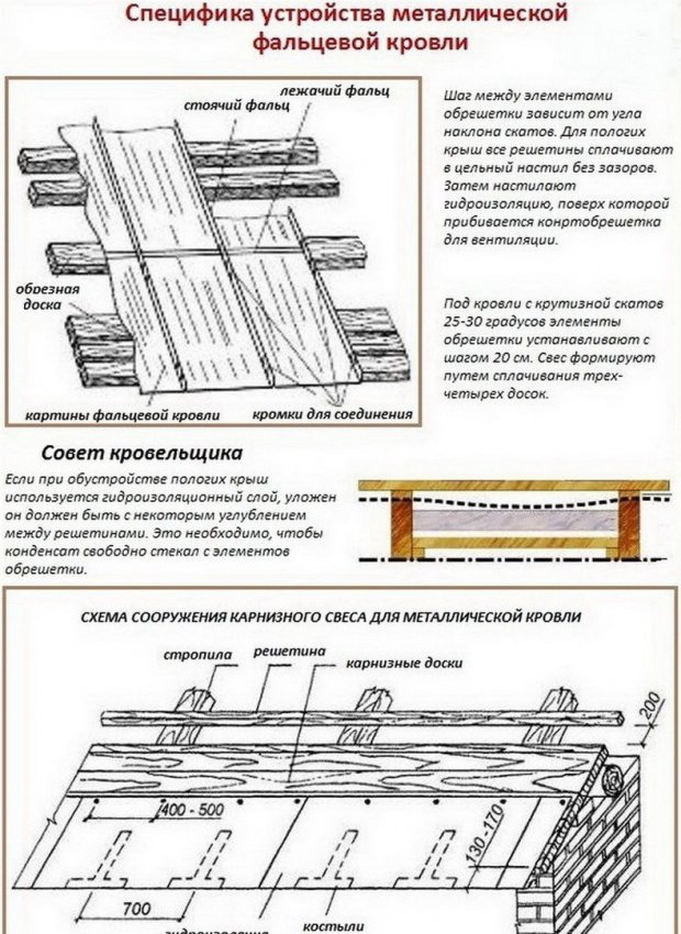 При устройстве металлической фальцевой кровли шаг обрешётки выбирается в зависимости от укла наклона скатов, а в нижней части карниза она всегда делается сплошной