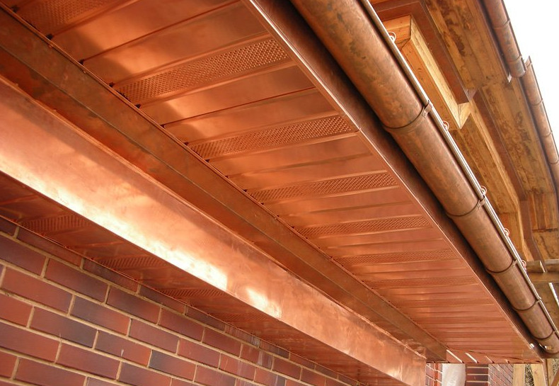 Подшивка карнизных свесов медными перфорированными софитами, высокоустойчивыми к температурным перепадам, обеспечивает вентиляцию подкровельного пространства и эффектный внешний вид всего здания