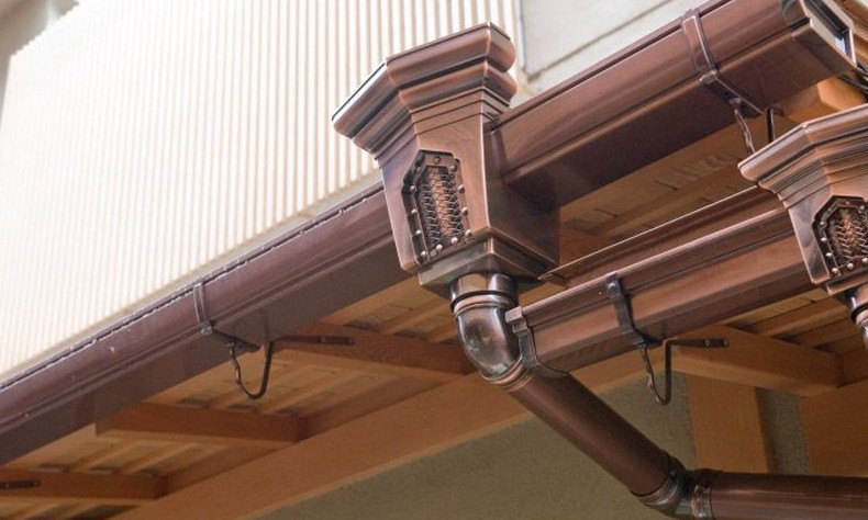 Медные водостоки монтируются при помощи пайки, служат до 150 лет и являются настоящим украшением дома