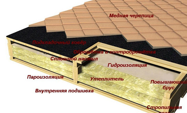 Структура кровельного пирога под утеплённую черепичную кровлю из медных штучных фрагментов отличается от случая с фальцевой кровлей наличием сплошной обрешётки и подкладочного ковра