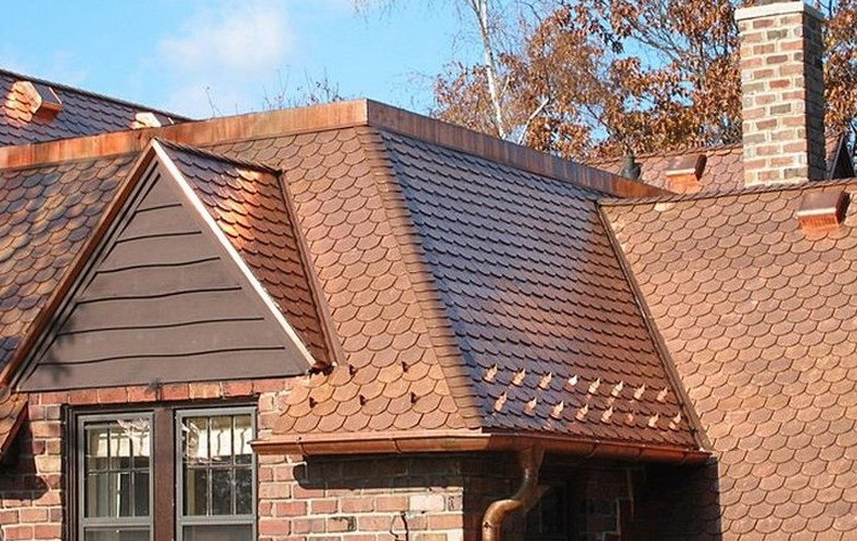Медная черепица чаще используется на сложных крышах с покатостью более 12º. Её применение минимизирует отходы, неизбежные при обустройстве сложных кровельных конструкций, сводя их практически к нулю. Тем более что сейчас изготавливаются крупноразмерные и мелкоразмерные черепичные фрагменты различной геометрической формы. Поэтому подобрать нужную медную черепицу труда не составит.