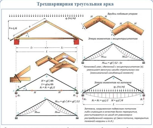 - Трёхшарнирная арка с ригелем используется для усиления стропильной системы при помощи создания дополнительного силового треугольника. Система применяется при значительных распирающих нагрузках. Соединение ригеля со стропилом должно быть неподвижным, в противном случае вся система не будет иметь необходимой жёсткости.