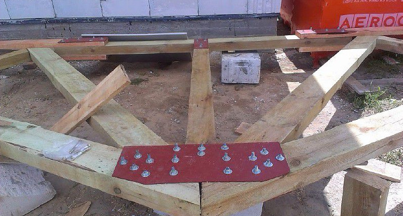 В коньковой части стропильные ноги обычно соединяются плоскими пластинами на болтах