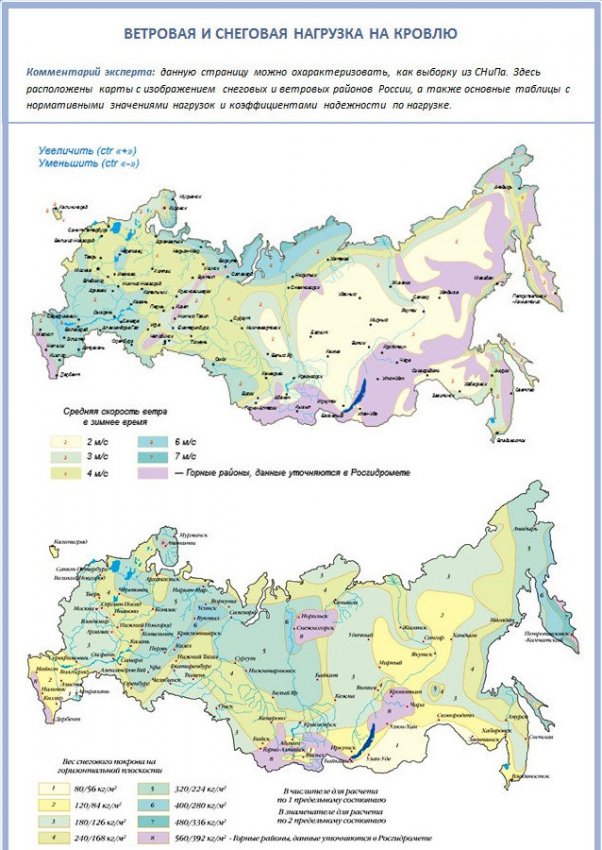 Очевидно, что тщательный расчёт нагрузок от снега и ветра с учётом местных климатических условий жизненно необходим при выборе конструкции и материалов кровли. Эти нагрузки можно определить по карте, составленной на основании СНиП 2.01.07–85.