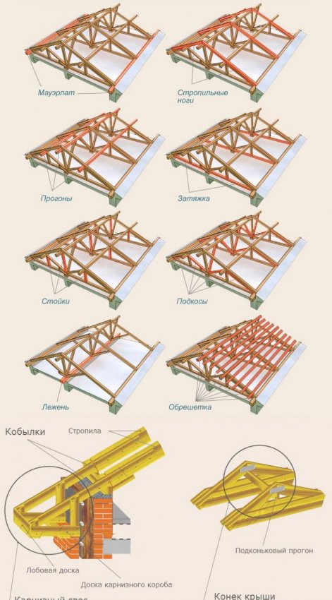 Кроме перечисленных используются также и другие элементы для усиления кровельного скелета. Весьма популярными являются подкосы и стойки, располагаемые в системе на местах наибольших нагрузок на стропила.