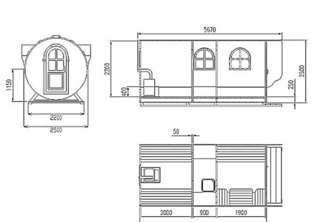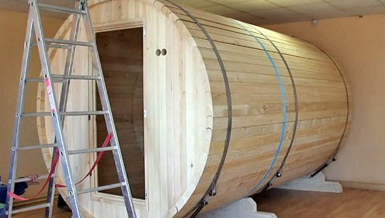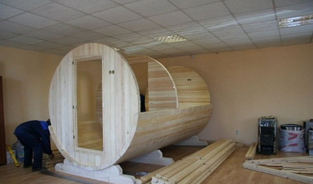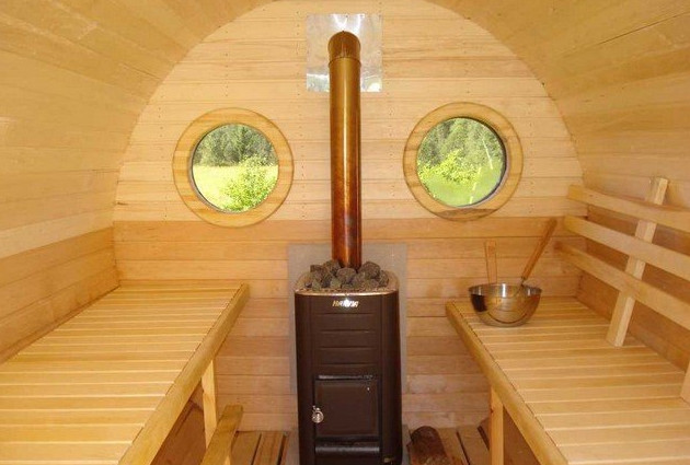 По своей сути такая баня представляет собой сруб бочкообразной формы, внутри которого находится небольшая печка, работающая как на твёрдом топливе, так и на электроэнергии.