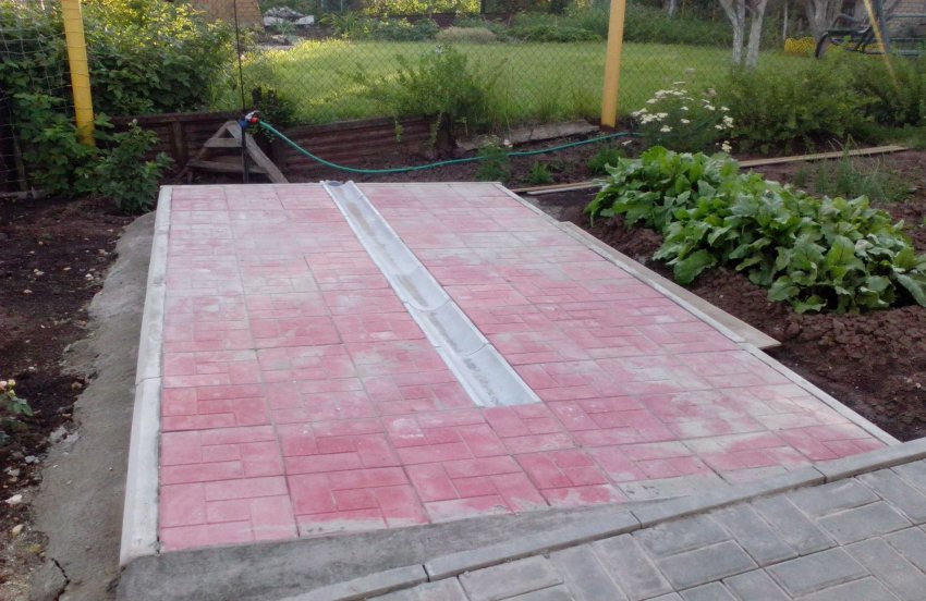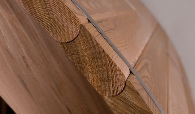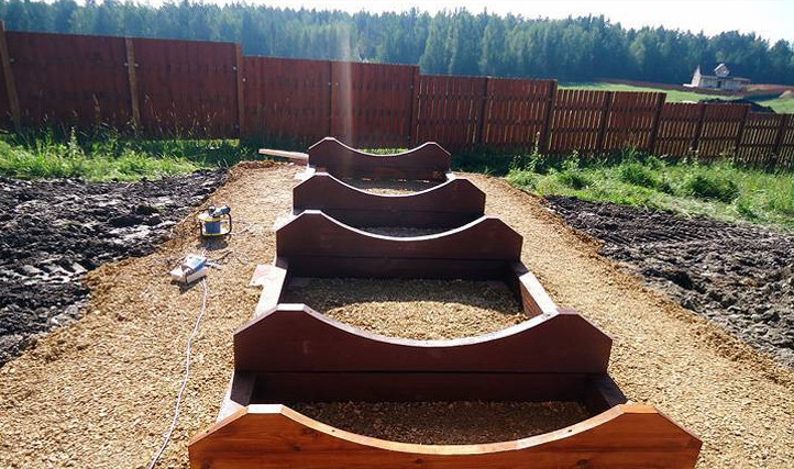 - Установить основание на подготовленную площадку с небольшим уклоном. Подвести трубу для слива воды. На основании в подготовленных перекладинах отметить центральную точку и к ней прикрепить первый элемент конструкции. Затем поочерёдно с двух сторон от центрального элемента уложить в пазы доски друг за другом. Следите за правильностью установки.