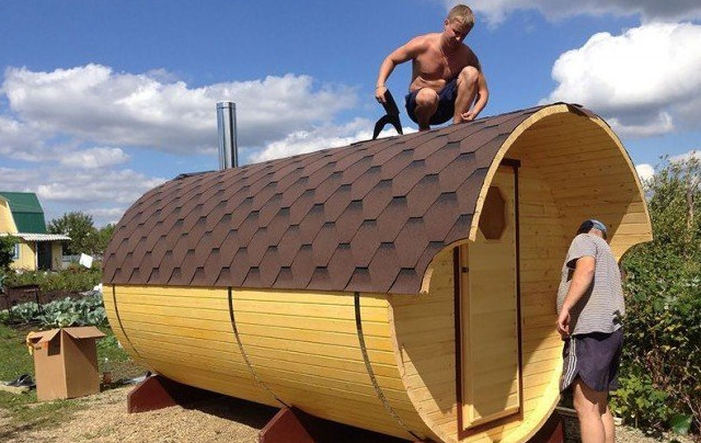- Теперь можно установить кровлю. Для бани-бочки подойдёт мягкая черепица или гибкие металлические листы. Можно сделать двускатную крышу и покрыть её металлочерепицей или профнастилом.
