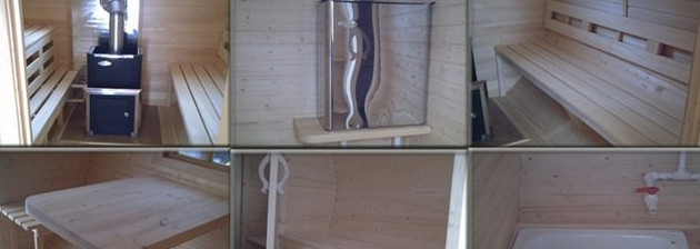 Так как в данной конструкции отсутствует моечная комната, то слив здесь не нужен. Внутри бани стоят широкие удобные деревянные лавки и печь–каменка. Для того чтобы создать эффект ароматерапии в помещении, на раскалённые камни капают немного эфирного масла или специальной настойки.