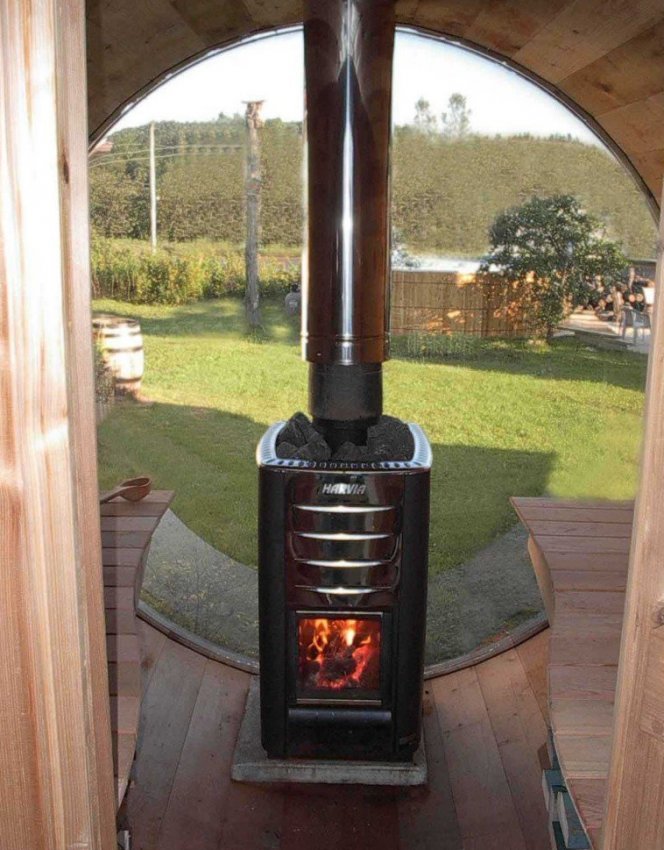 Печка с дымоходом в бане-бочке может быть дровяной или электрической