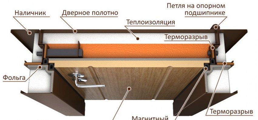 - Подобрать дверь с функцией терморазрыва, например, с полиамидной вставкой. Такой вариант обеспечит нейтрализацию низких температур, то есть даже при сильных морозах внутренняя часть полотна не будет холоднее +10 градусов. Главным недостатком конструкций с терморазрывом является высокая стоимость, а также негерметичность замочной скважины.