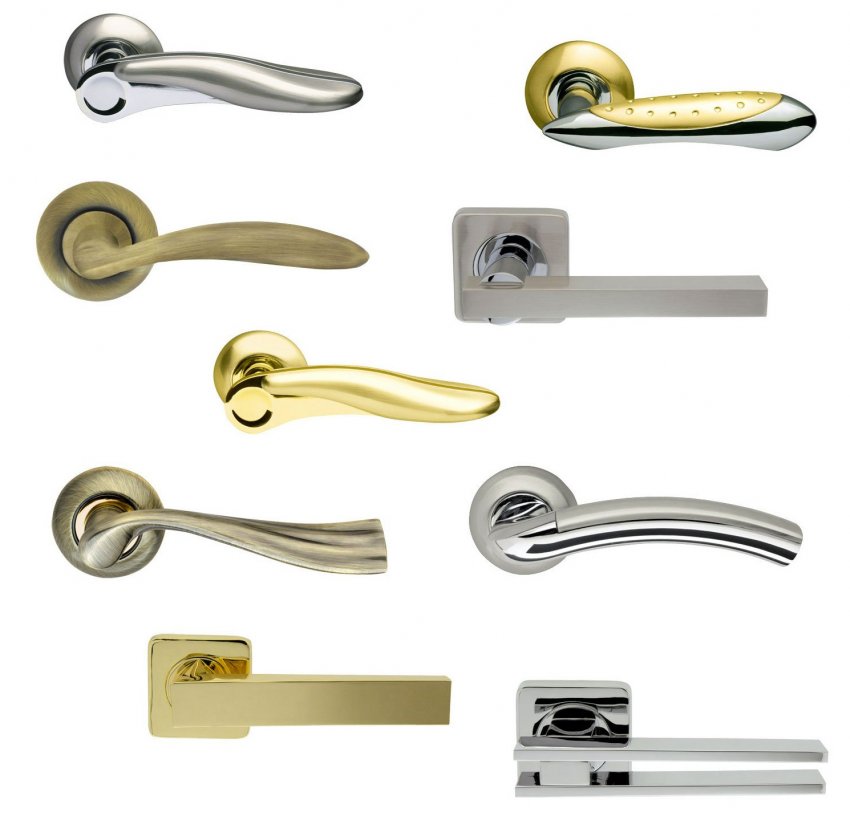 - Дверные ручки — подбираются в соответствии с предпочтениями домочадцев и могут быть любой формы, размера, расцветки. Не рекомендуется приобретать дешёвые ручки, поскольку они недолговечны и будут постоянно ломаться.