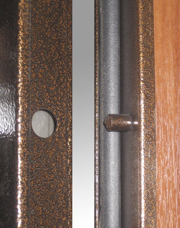 - Противосъёмные штыри обеспечивают защиту полотна от открывания даже при срезанных петлях и взломанных замках.