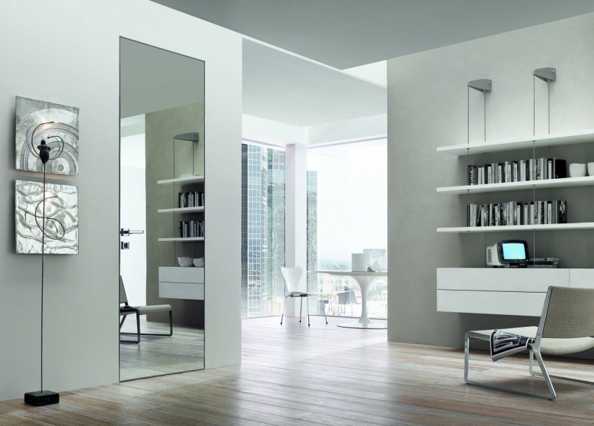 Зеркальная дверь может заменить собой стационарное зеркало, тем самым сэкономив полезное пространство комнаты