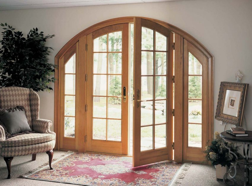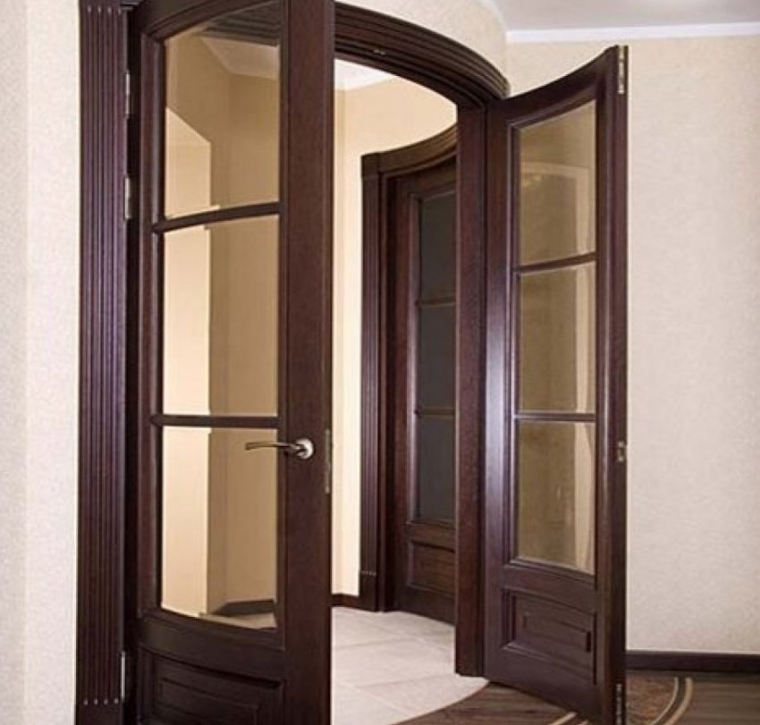 Распашные двустворчатые двери могут отличаться по форме: прямоугольные, арочные или с фрамугой. Последний вариант используется в случае очень высокого дверного проёма. Фрамуга бывает глухой или остеклённой и увеличивает приток естественного света или визуально дополняет высоту двери.