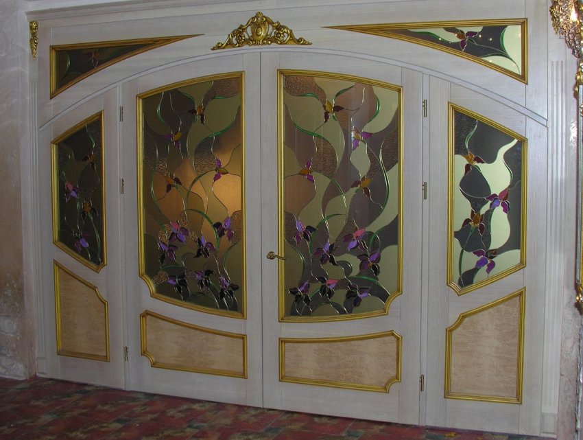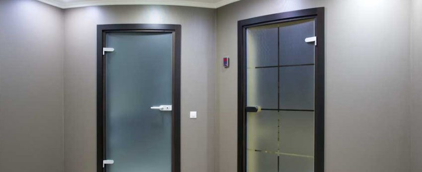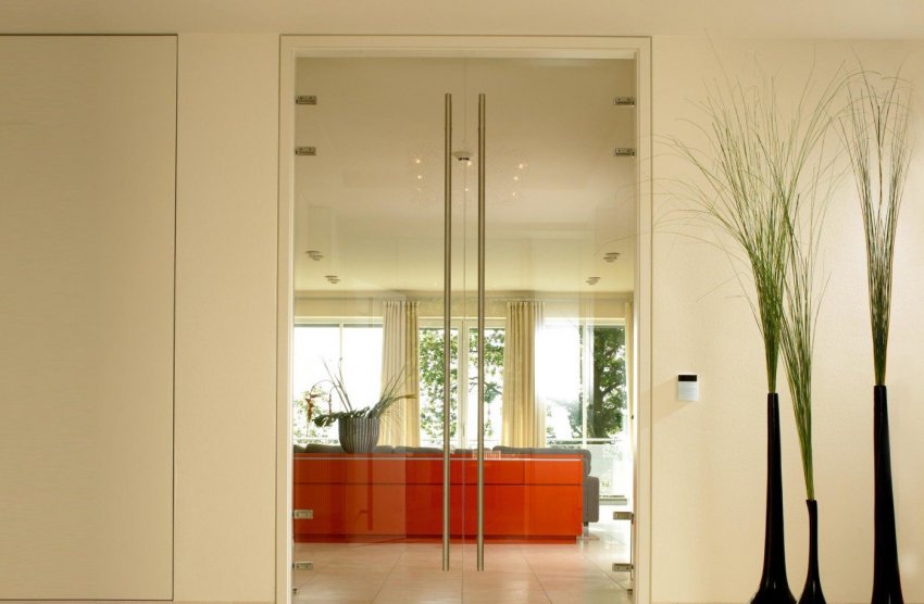 Конструкции, состоящие полностью из стекла, встречаются очень редко и устанавливаются только между комнатами. Больше распространены двери с частичным остеклением или полотном, заключённым в раму. Но и такие двери чаще используются в общественных заведениях. В жилом помещении прозрачная дверь поможет визуально увеличить пространство. Стекло обязательно должно быть закалённым и состоящим из нескольких слоёв.
