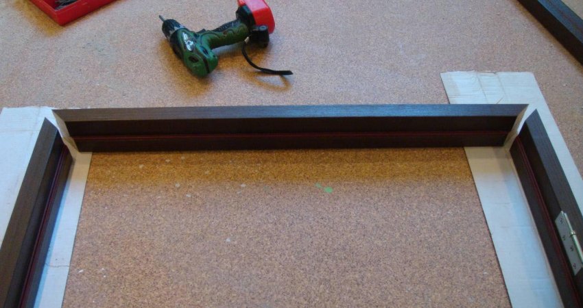 - После того как коробка собрана, укладываем в неё дверное полотно. Отмечаем места крепления навесов.
