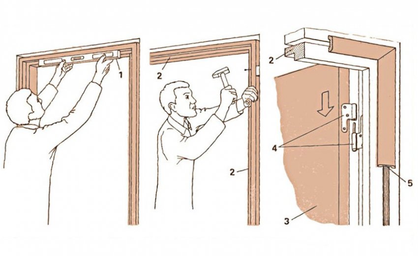 Дверная коробка должна быть больше дверного проёма на 3–5 мм, так как при стягивании шурупами её размеры уменьшатся.