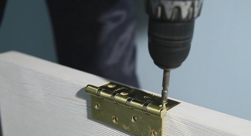 - Крепим навесы к коробке. Если используются неразъёмные петли, их нужно прикрепить сначала к полотну, а потом вместе с ним — к дверной коробке.