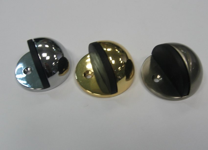 - Ограничители или упоры. Бывают напольными и настенными, используются для предотвращения чрезмерного открытия двери и ударов её об стену. Могут иметь мягкую поверхность, чтобы избежать повреждения дверного полотна.