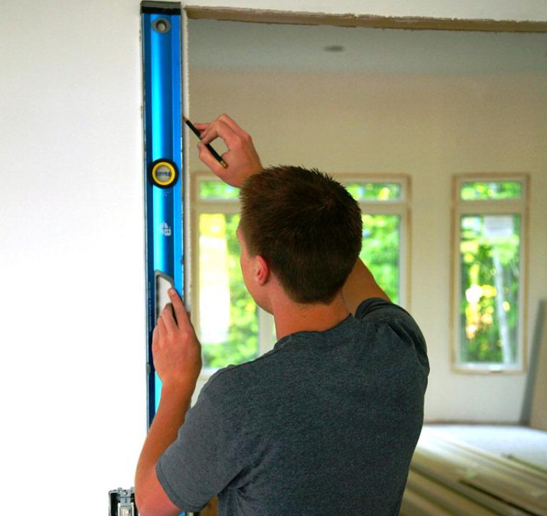 - Производится геометрическая разметка для установки новой дверной рамы. На этом этапе важно соблюдать строго вертикальные и горизонтальные привязки для установки дверей. Максимальная погрешность, допустимая на высоте 2 метров, составляет 2 мм. В горизонтальной плоскости искажение дверной оси не должно превышать 1 мм. Наилучшим помощником в разметке дверной рамы считается лазерный строительный нивелир.